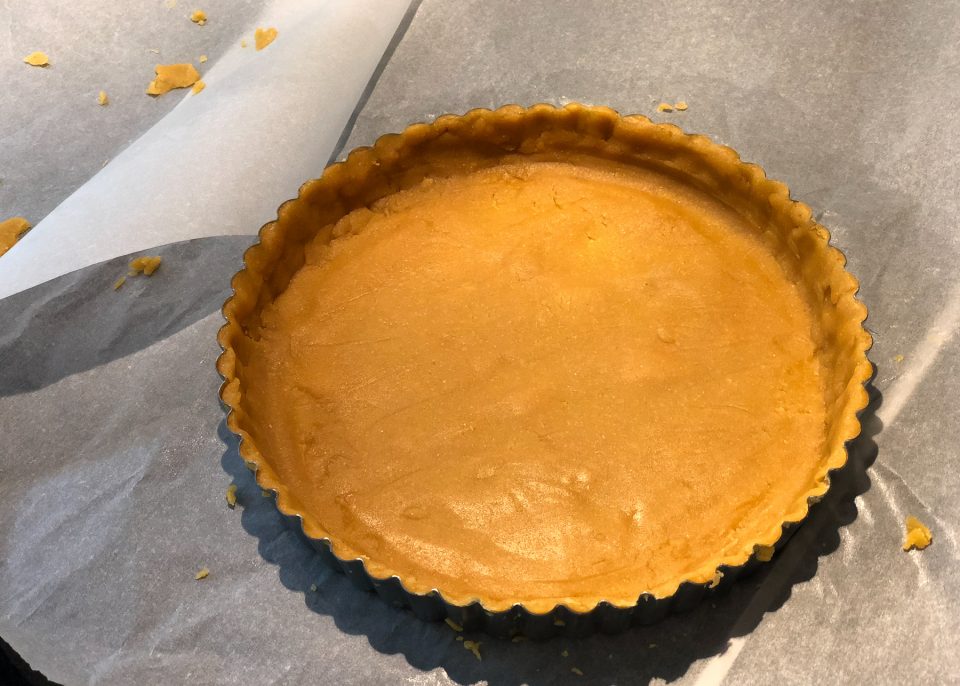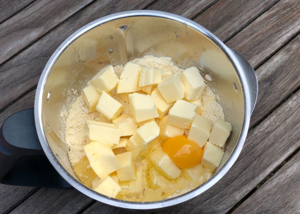 Alles in den Thermomix auf Stufe 6-7 zu einem Teig verarbeiten. Teig teilen und jeweils ausrollen. Teig reicht für zwei mittelgroße Formen. Mindestens 2 h kühlen, bevor der Teig gebacken wird. Mit Füllung auf 180 Grad Umluft ca. 40-45 min. Evtl. Teig vorher alleine für ca. 10 min backen.